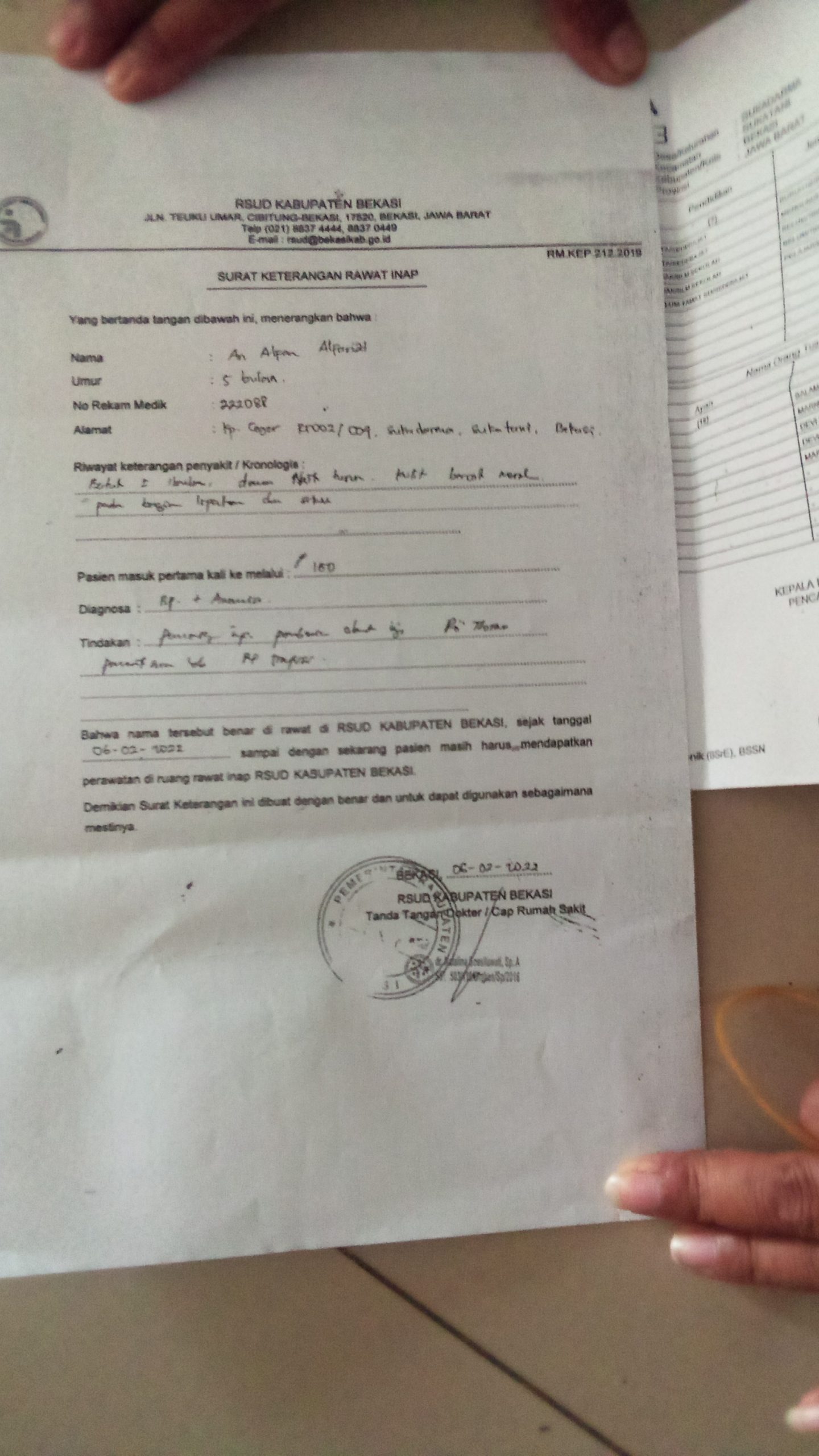 Menurut Keterangan Devi Saputri pada awak Media Menjelaskan Bahwa anak balitanya Yang Berusia Enam Bulan Menderita Sakit Infeksi Paru dan Mata, Saat Ini Di Rawat Di Rumah Sakit Umum Daerah Kabupaten Bekasi Ruang PICCU.