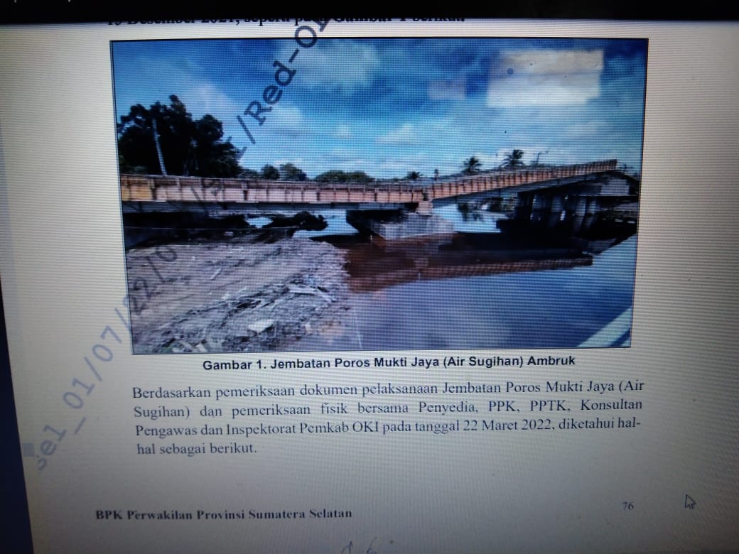 Menurut Koordinator Komunitas Masyarakat Anti Korupsi Indonesia Sumatera selatan pasca rubuhnya jembatan sebelumnya BPK dalam auditnya mengatakan bahwa Hasil pelaksanaan pekerjaan Jembatan Poros Mukti Jaya (Air Sugihan) ambruk setelah diserah terimakan, Pekerjaan Jembatan Poros Mukti Jaya (Air Sugihan) yang telah diserah terimakan tanggal 4 November 2021 ambruk pada posisi Pier 1 (arah Jalur 27) pada tanggal 15 Desember 2021 ,” kata Boni Belitong