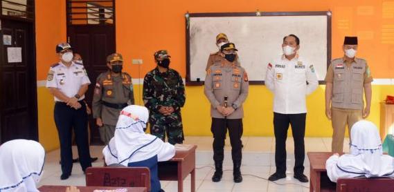 SINERGINKRI.COM, OKU SELATAN – Bupati Ogan Komering Ulu Selatan, Popo Ali Martopo.,B.Com, Wakil Bupati OKU Selatan, Sholehien Abuasir, S.P., M.Si., Bersama Kapolres OKU Selatan AKBP. Indra Arya Yudha.,S.H S.I.K.M.H dan didampingi sejumlah pejabat daerah lainnya melakukan monitoring pelaksanaan pembelajaran tatap muka (PTM) di sejumlah sekolah di Kabupaten OKU Selatan, Selasa (07/09/2021).