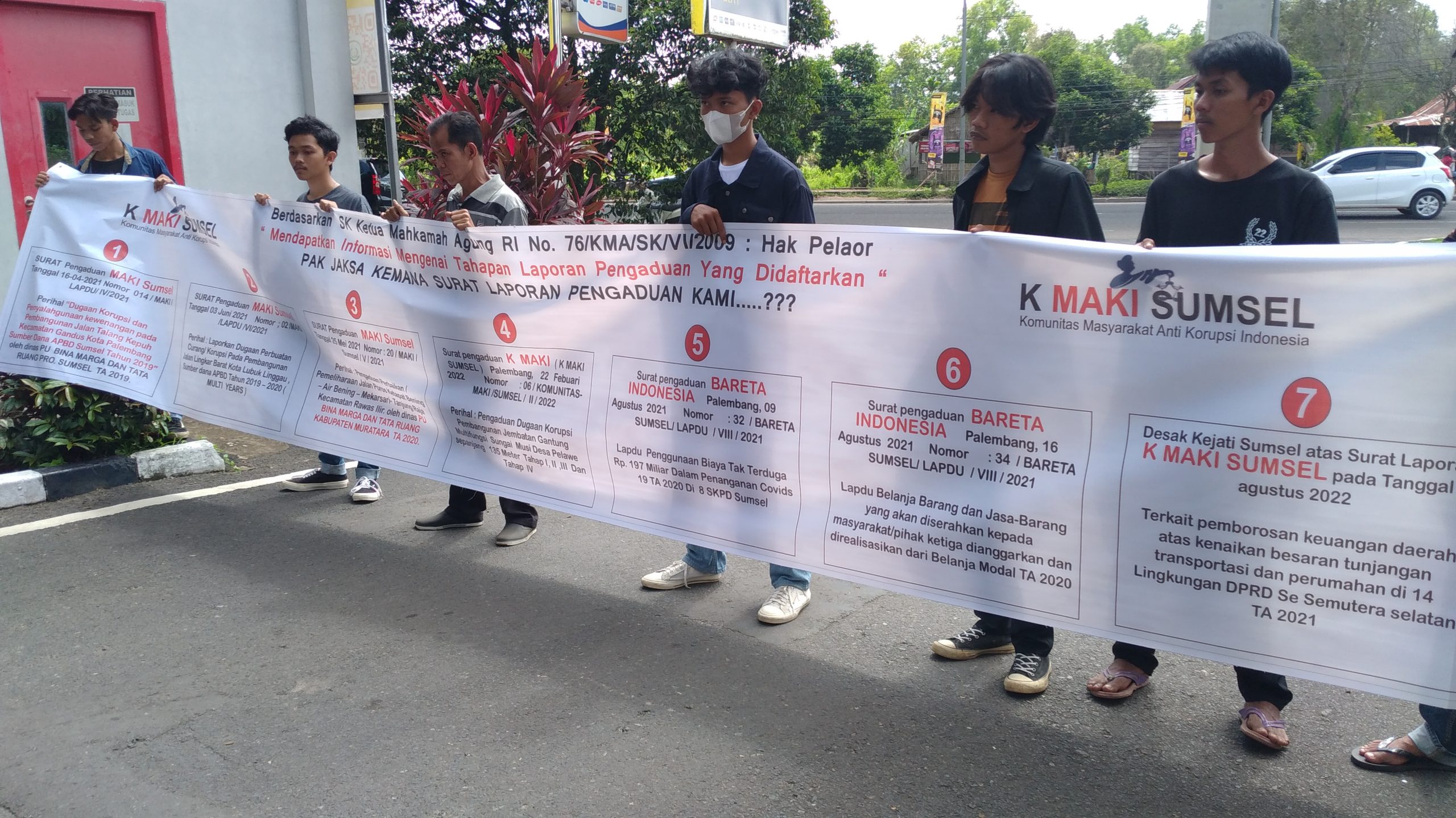 Menurut Koordinator K MAKI Sumsel Boni Belitong selaku korak dalam aksi damai tersebut mengatakan, dalam kesempatan ini kami akan menggunakan hak kami selaku pelapor, karena ini sudah di atur dalam SK Ketua Mahkamah Agung RI No. 76/KMA/SK/VI/2009 yang salah satu point nya menyatakan hak pelapor berhak mendapatkan informasi mengenai tahapan laporan pengaduan yang didaftarkan, “ jelas Boni Belitong dalam aksinya.