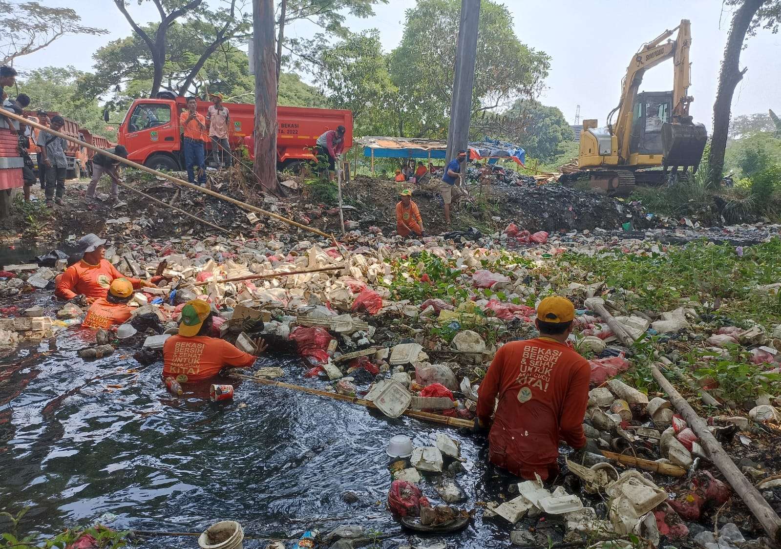 Kegiatan bersih-bersih sampah di saluran irigasi, mengerahkan alat berat dari Pemkab Bekasi, dibantu oleh petugas RT/RW dan perangkat desa Karangsatria menggunakan alat manual.