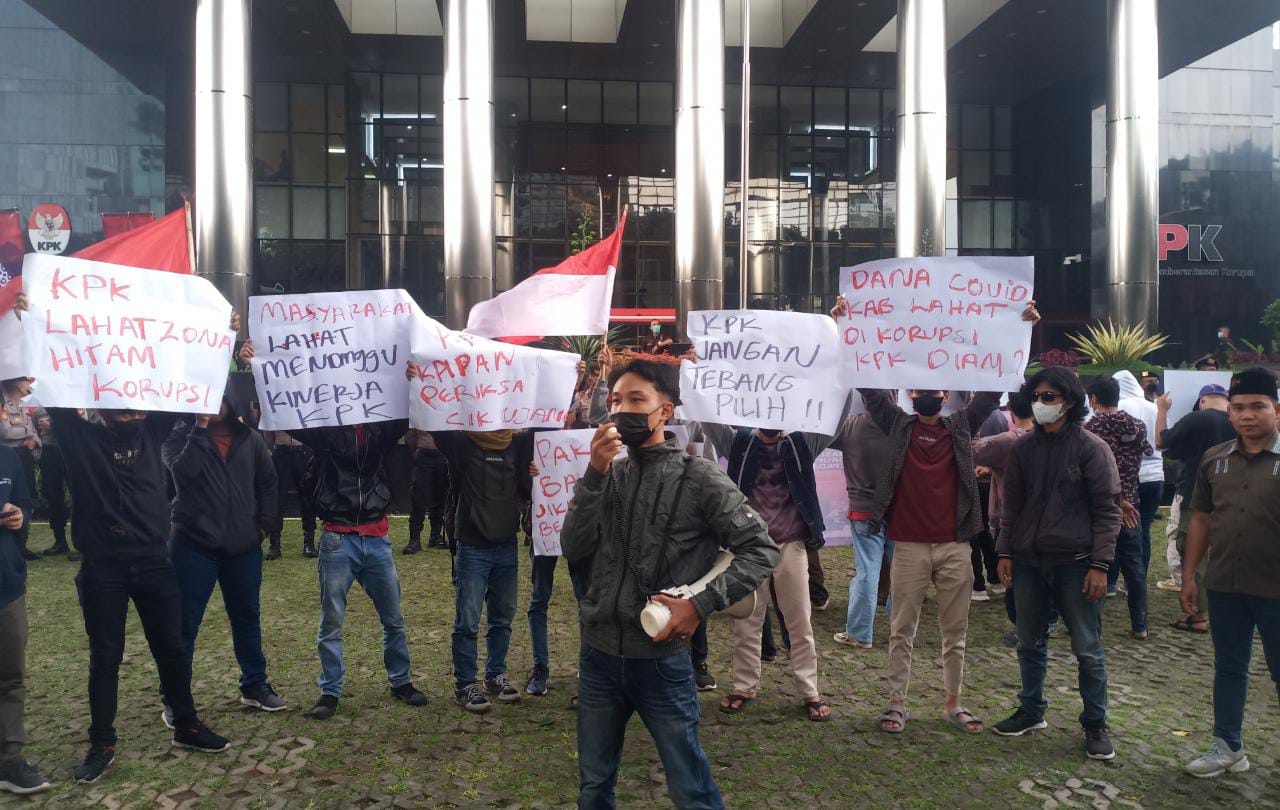 Gagak melakukan aksi demonstrasi depan Gedung Merah Putih KPK RI, Kuningan, Jakarta Selatan di Jakarta, Rabu (9/3/2022). Menurut koordinator Gagak Imam Hanafi mengatakan, dugaan korupsi dana Covid-19 tahun 2020 Kabupaten Lahat telah dilaporkan ke KPK .
