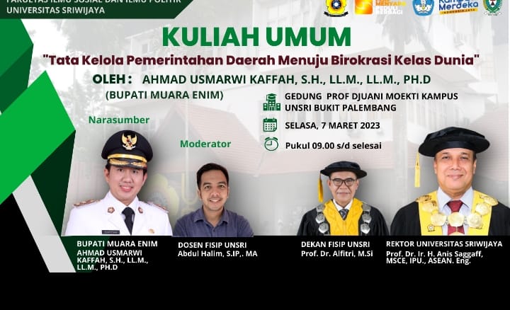 FISIP UNSRI Gelar Kuliah Umum Bersama Bupati Muara Enim Ahmad Usmarwi Kaffah,SH.,LLM (Bham)
