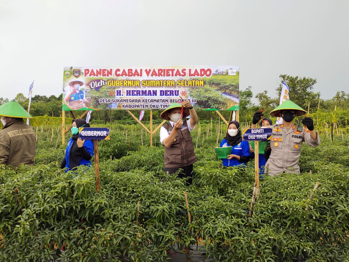 SINERGINKRI.COM, OKU TIMUR – Kehadiran Gubernur Sumatera Selatan H. Herman Deru didampingi Bupati OKU Timur H. Lanosin, S.T. ikut melakukan panen cabai bersama para kelompok petani di Desa Sukanegara Kecamatan Belitang III OKU Timur. Selasa, 7 September 2021.