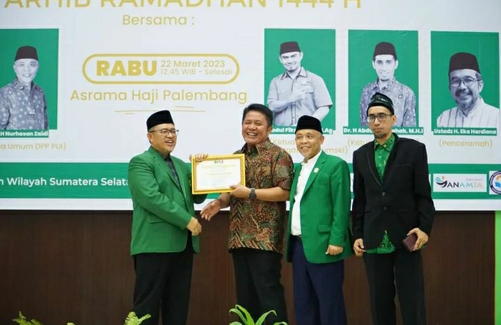 Gubernur Sumsel Herman Deru dianugerahi sebagai Tokoh Terbaik Sumatera Selatan Tahun 2022 yang diberikan langsung oleh Ketua Majelis Syuro PUI, Dr. H. Ahmad Heryawan, LC, M.Si, (22/03/2023)