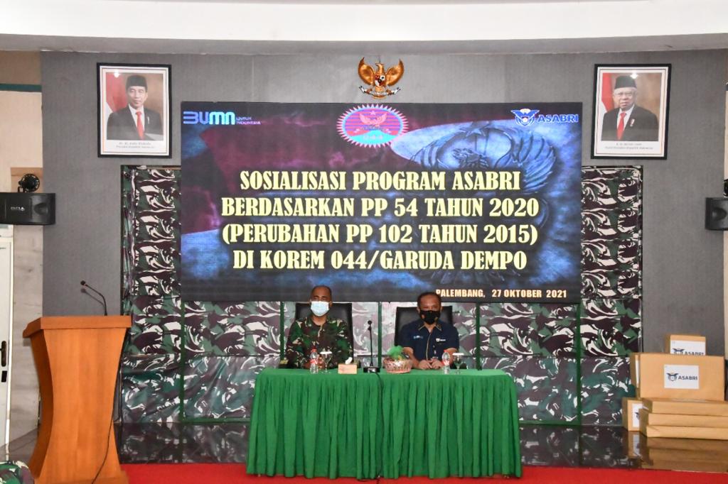 SINERGINKRI.com, PALEMBANG, – Jajaran Korem 044/Gapo ikuti Sosialisasi Program Asabri berdasarkan PP 55 Tahun 2020 yang bertempat di Balai Prajurit Jalan Jenderal Sudirman Km 4.5, Rabu (27/10/2021).