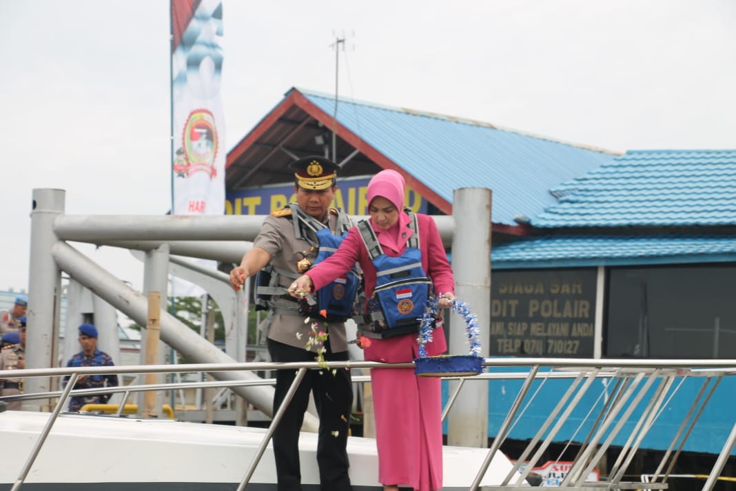 Tampak Kepala Kepolisian Daerah Sumatera Selatan Inspektur Jenderal Polisi Drs Toni Harmanto MH didampingi Wakapolda Sumsel Brigjen Pol Rudi Setiawan,SIK,SH MH ,Ketua Bhayangkari Sumsel Ny. Yesika Toni dan Wakil nya Ny Diana Rudi melakukan tabur bunga, sebagai bentuk penghargaan kepada para pahlawan yang gugur dalam pertempuran dilaut.