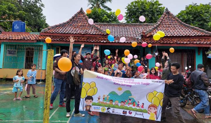 Serang, Sinerginkri.com | Komunitas Relawan Banten bersama Criminal Law Student Association (CLSA), bersama BEM Fakultas Hukum Untirta, Padepokan Kupi, dan Haji Rocker Foundation, menggelar Trauma Healing untuk anak korban banjir di Kaloran Pena, Kota Serang, Banten, Minggu (6/3/2022).