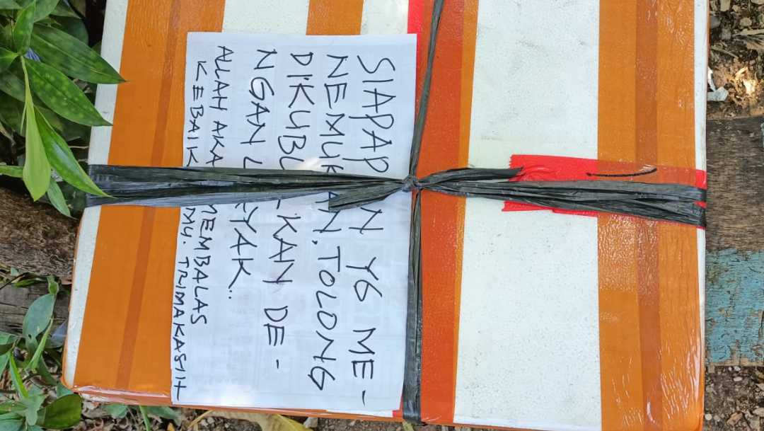 Kotak ditemukan warga sekitar jam 8 pagi WIB. Saat ditemukan, kotak dari styrofoam itu dalam kondisi dilakban warna kuning bertuliskan, “SIAPA PUN YANG MENEMUKAN TOLONG DIKUBURKAN DENGAN LAYAK. ALLAH AKAN MEMBALAS KEBAIKANMU.”