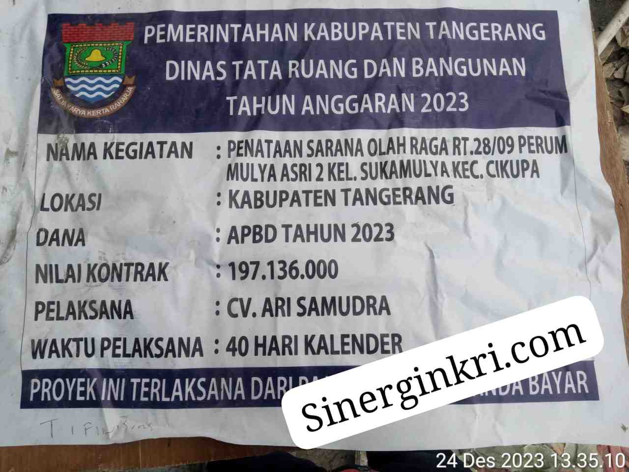 Tangerang, Sinergikri.com | Pembangunan penataan sarana Olahraga yang berlokasi di RT28/09 Perum Mulya Asri II, Kelurahan Sukamulya Kecamatan Cikupa Kabupaten Tangerang, diduga abaikan peraturan yang ditentukan dinas.