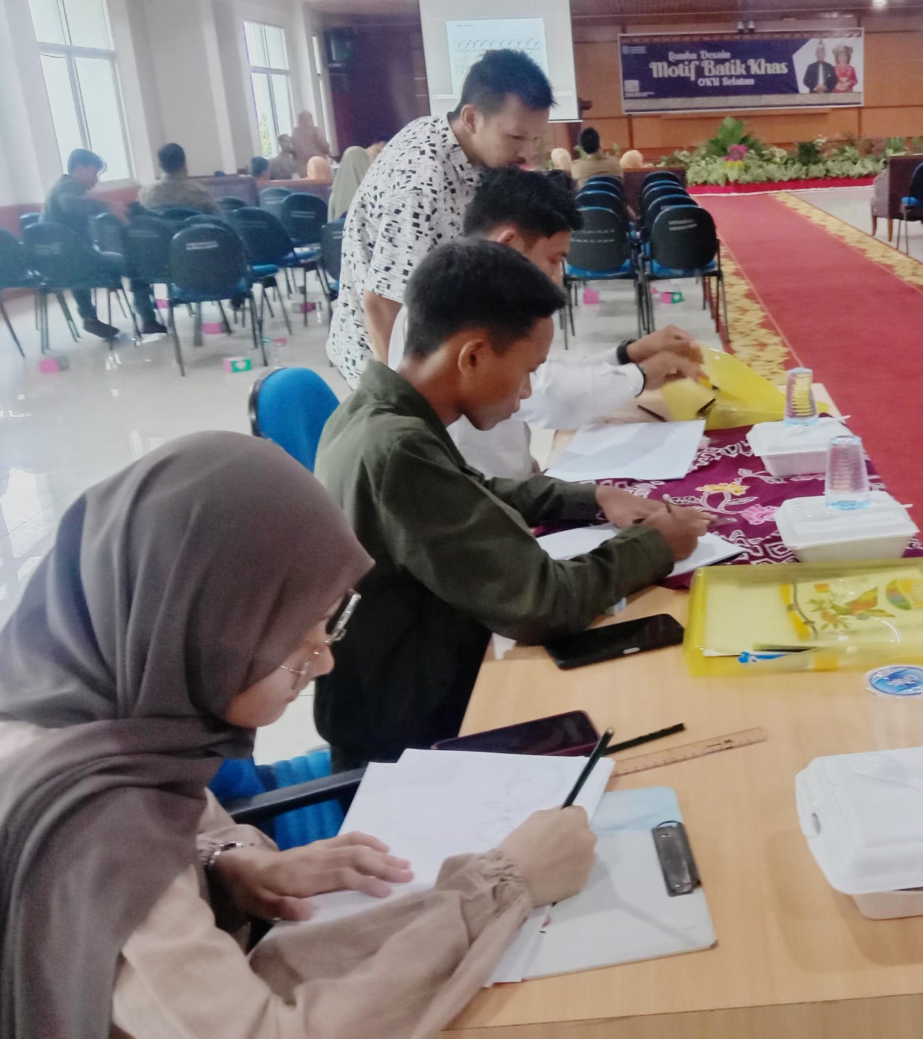 Dari pantauan awak media di lokasi kegiatan terlihat peserta sedang menjelaskan desain batik yang dibuat di hadapan dewan juri untuk menilai hasil karya desain motif dari peserta, terlihat dari peserta yang menampilkan desain batik yang bercorak ciri khas OKU Selatan seperti motif kopi, motif alpukat, motif air saka selabung, motif danau ranau, motif burung walet, motif burung walet, dan motif motif lainnya yang identik dengan yang ada di OKU Selatan.( dral )