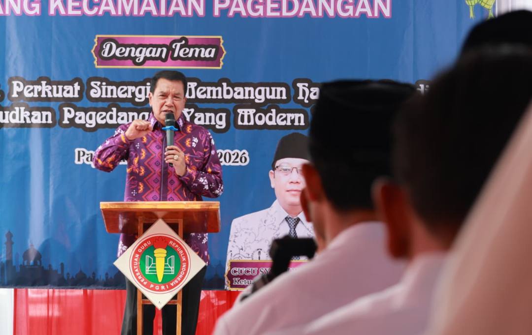 Bupati Maesyal Rasyid komitmen saat menghadiri acara Halal Bihalal Persatuan Guru Republik Indonesia (PGRI) se-Kecamatan Pagedangan di SDN III Cihuni, Kamis (2/4/26).