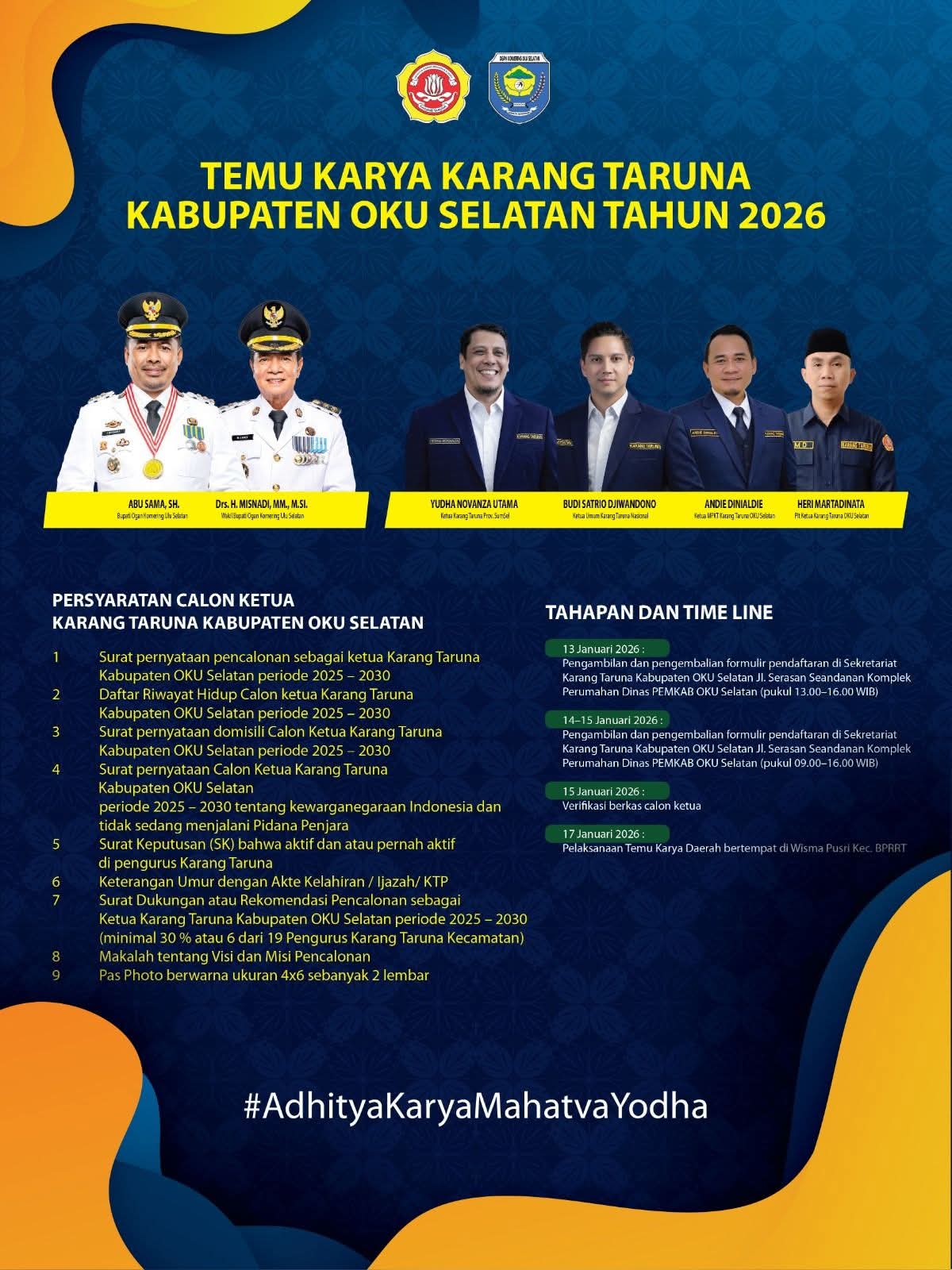 Muaradua,Sinerginkri.com – Karang Taruna Kabupaten Oku Selatan resmi membuka pendaftaran bakal calon (bacalon) ketua karang taruna kabupaten dalam agenda Temu Karya Karang Taruna Kabupaten. Pendaftaran bertempat di sekretariat karang taruna kabupaten Oku Selatan. jalan Serasan seandanan komplek perumahan dinas Pemkab Oku Selatan.