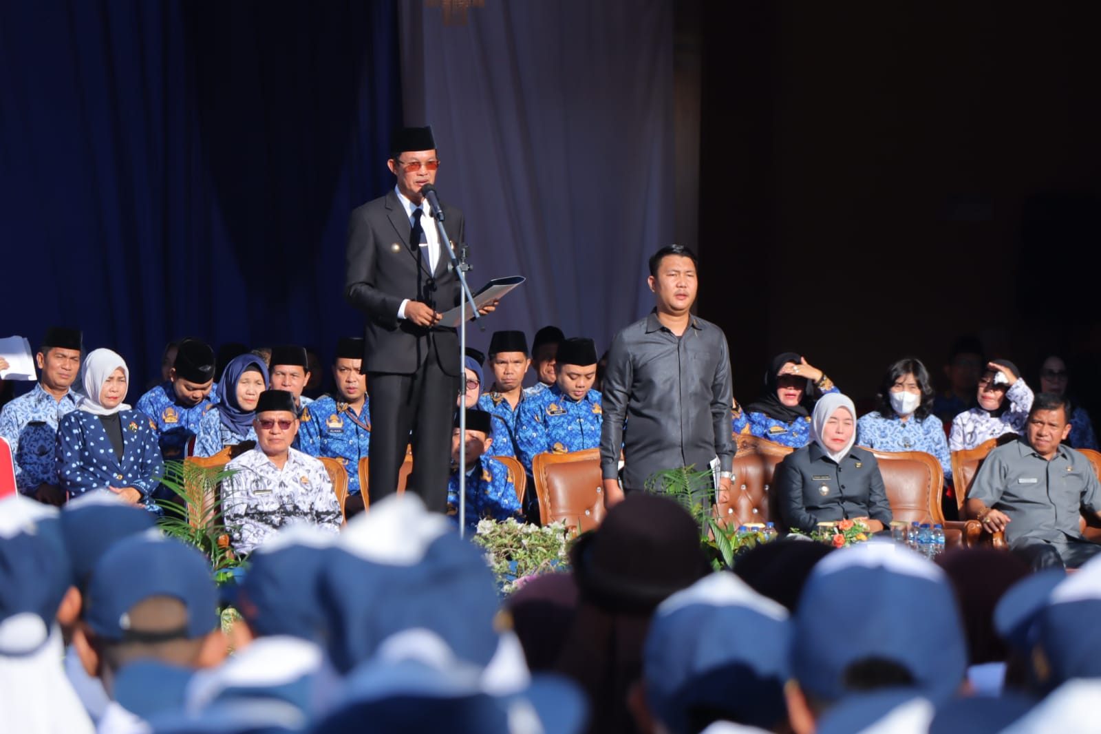 Upacara peringatan Hari Pendidikan Nasional (Hardiknas) 2 Mei 2023, Walikota Palembang, H Harnojoyo bersama Wakil Walikota Palembang, Fitrianti Agustinda