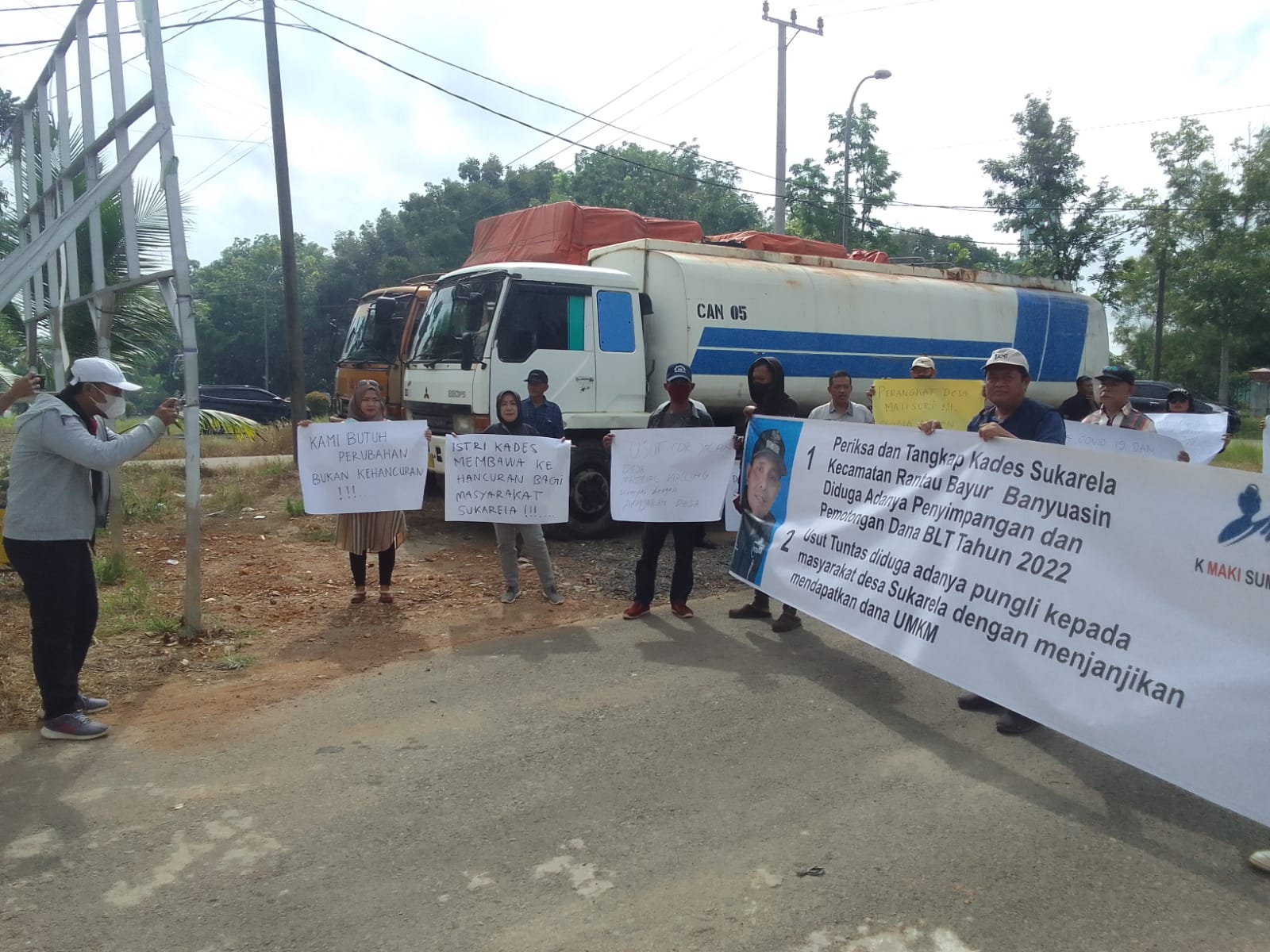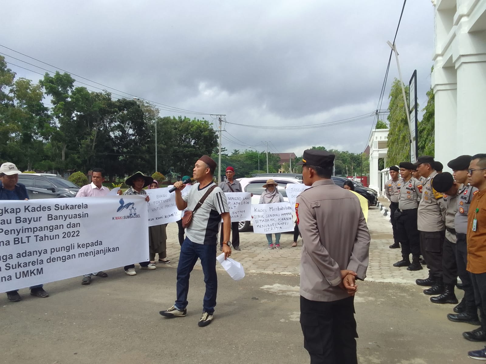 Masyarakat Desa Sukarela bersama K MAKI Demo dideoan Kejati Banyuasin pertanyakan laporan dugaan penyimpangan BLT dan Pungli UMKM