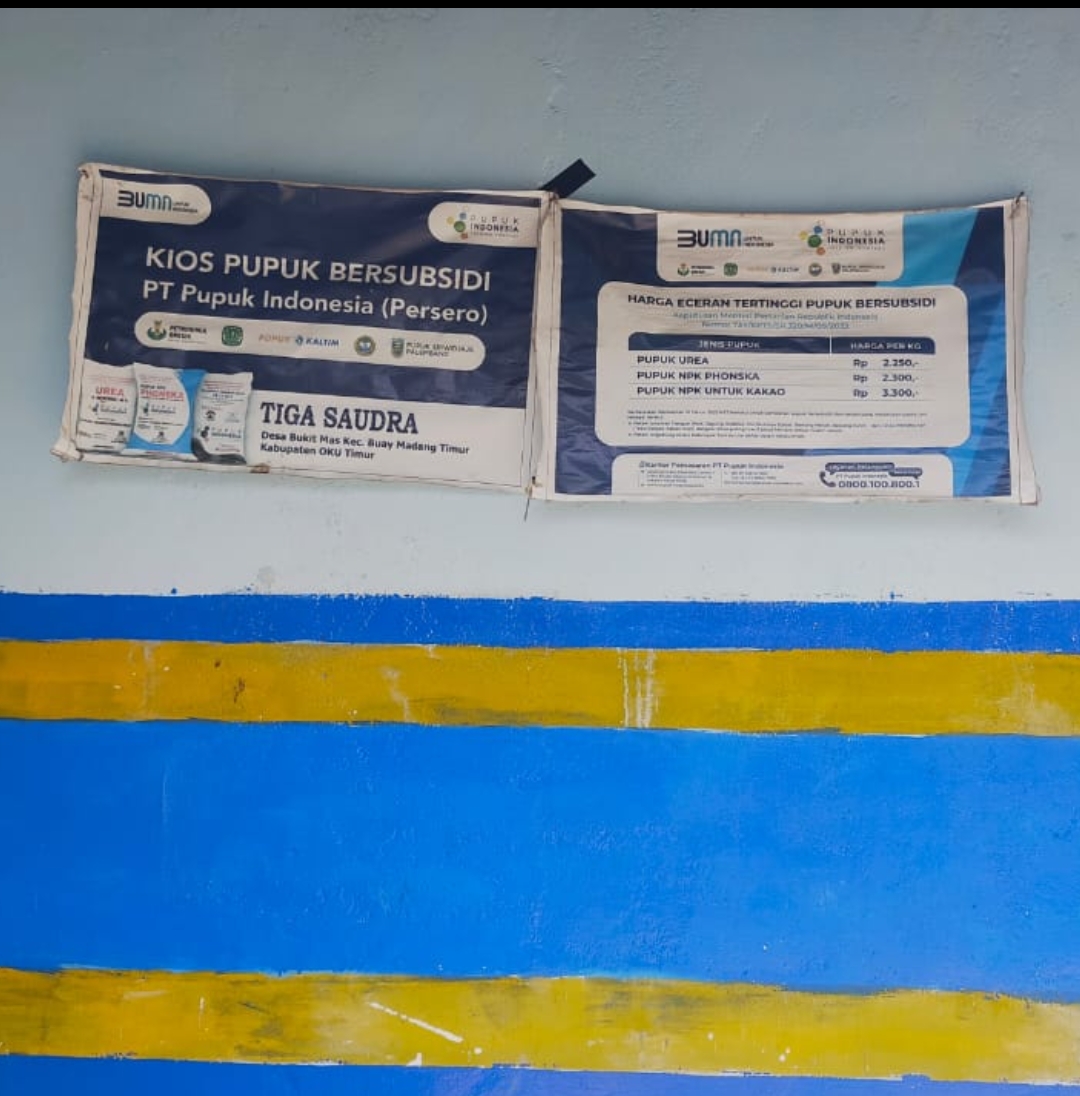 Kelompok tani Maju Tani berdasarkan RDKK nya mereka membeli pupuk di Kios Tiga saudara dengan alamat Desa Bukit mas kecamatan BMT OKU Timur.