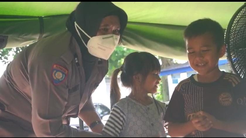 Dalam menjalankan tugas sebagai Bhabinkamtibmas, Aiptu Reni tetap membantu para korban di pengungsian dan menghibur anak-anak yang menjadi korban gempa.