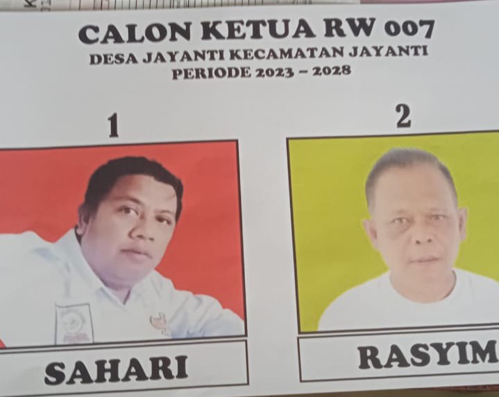 Hasil perolehan suara nomor (1) Sahari memperoleh suara sebanyak 260 suara, sedangkan Rasyim mendapat 174 suara, dan suara tidak Sah 25 suara. Unggul nomor urut (1) Sahari terpilih menjadi ketua RW 007, Kampung Rengkod Desa Jayanti.